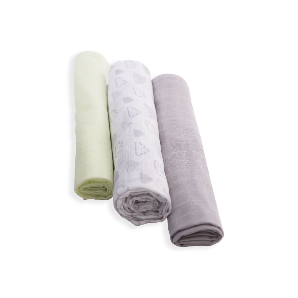 Este set de muselinas está compuesto por dos muselinas de 70 x 70 cm y una muselina más grande a 100 x 120 cm.