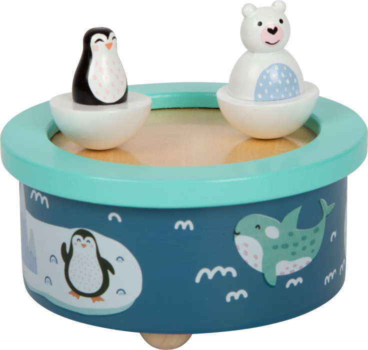 Cuando el pingüino y el oso polar te invitan a bailar, los sueños dulces están garantizados. Esta caja de música de madera con diseño ártico toca la soñadora melodía "Twinkle twinkle little star" mientras el oso polar y el pingüino dan vueltas en el témpano de hielo al son de la música. Las dos figuras de madera son desmontables y, gracias a su facilidad de uso, también puede ser manejada por los niños de forma independiente.