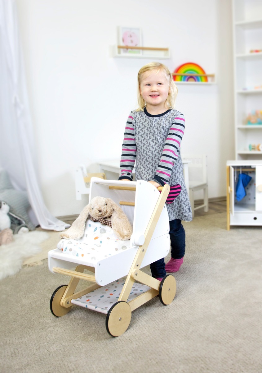 El cochecito destaca por su sencillo diseño escandinavo, y por ser espacioso bajo el asiento. Gracias al techo plegable los muñecos/juguetes blandos pueden viajar viendo hacia adelante o hacia atrás. ¡La cama reversible de género neutro con un edredón de gran tamaño asegura que los muñecos/juguetes de peluche de hasta 46 cm de altura estén cómodos! Tiene ruedas suaves de goma para un viaje seguro, silencioso y protege los suelos delicados.