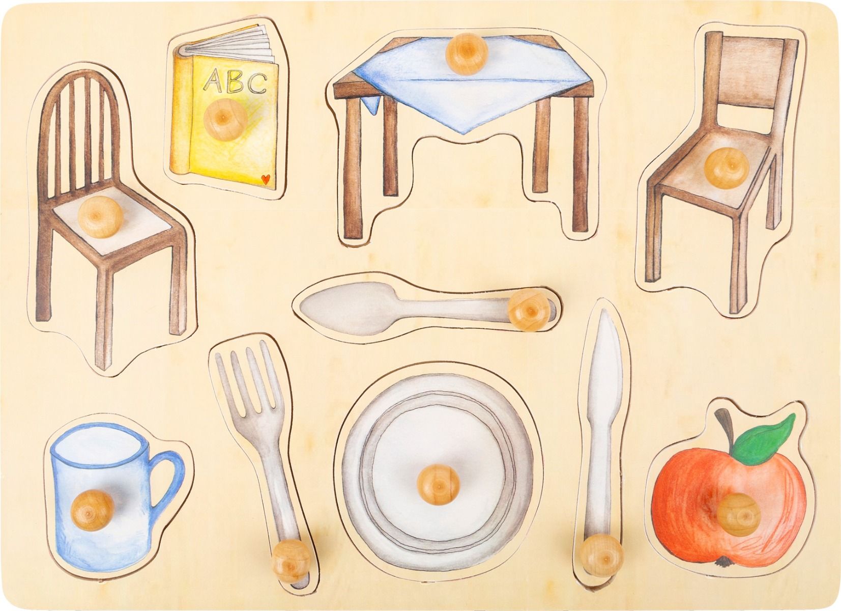 Este robusto juego de puzzle de madera contiene piezas ilustradas con botones de madera y todo gira en torno a objetos cotidianos familiares. Las piezas del puzle pueden ser fácilmente agarradas por los niños pequeños y colocadas en su lugar correcto.Esto fomenta las habilidades motoras finas y la paciencia de una manera juguetona.