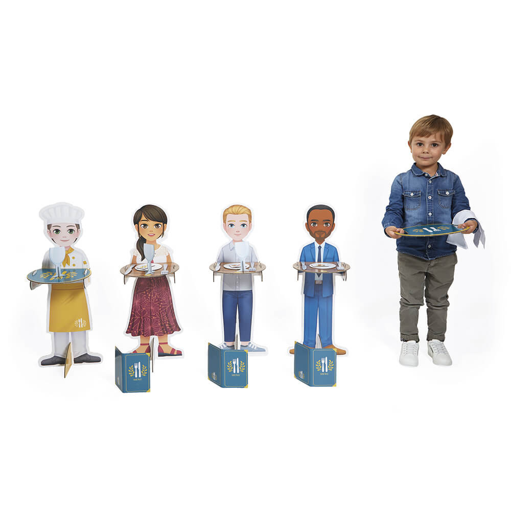 ¡Bienvenidos al restaurante! ¿Tienen una reserva? Con este conjunto de accesorios y personajes de cartón, ¡los niños se convertirán en verdaderos camareros o jefes de sala! ¡Con cuatro personajes de 65 cm de altura —tres clientes y un chef—, y multitud de accesorios! Los niños de a partir de 3 años podrán imitar a los mayores y montar su propio restaurante. Da la bienvenida a los clientes, toma pedidos, ofrece menús, sirve comida y bebida, ¡y no te olvides de cobrar a los clientes! Este completo juego de imitación contiene 108 accesorios en total, suficientes para divertirse durante horas e invitar a sus pequeños clientes a pasar una agradable velada en torno a una buena comida. ¡Este juego permitirá a los niños desarrollar su imaginación y su capacidad para organizarse y jugar a ser el gerente de su propio restaurante! ¿Por qué no aprovechar para discutir con ellos nociones importantes para sus futuras salidas al restaurante? Como lavarse las manos, comportarse bien en la mesa o ser educado. Juego de cartón procedente de bosques gestionados de forma sostenible, con certificado FSC®.