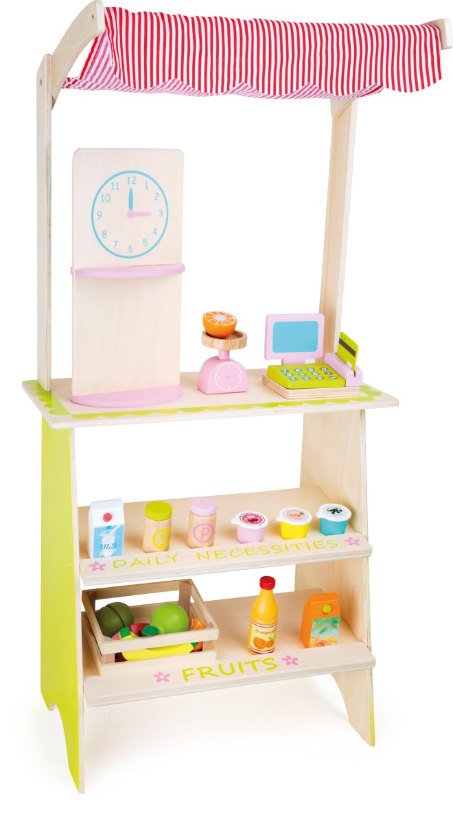 Cubierto con un toldo, este puesto de venta hecho en madera es fantástico para que los niños puedan jugar a tener su propía tienda.