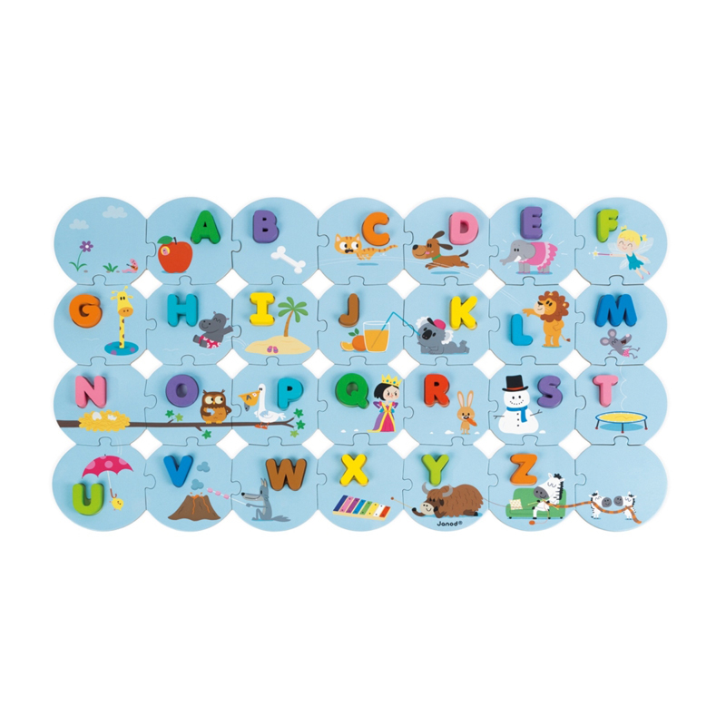 Cada pieza del rompecabezas se compone de una letra y una imagen, y debe encontrar la siguiente letra correcta para completar su rompecabezas. Este rompecabezas es perfecto para enseñarles el alfabeto a los niños y para desarrollar sus habilidades motoras finas.