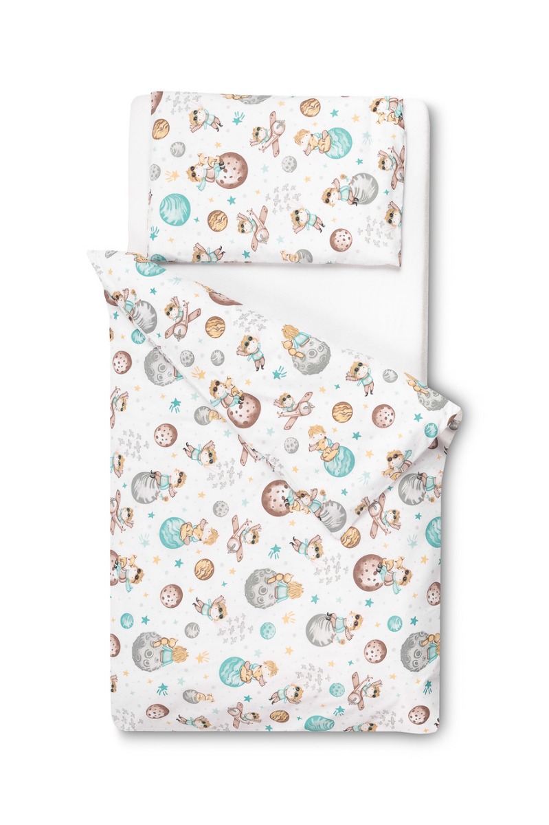 La ropa de cama Planetas es perfecta para la habitación de tu pequeño astronauta. Fabricada en algodón 100% de alta calidad, es suave y duradera, ideal para pieles sensibles. El juego incluye una funda nórdica de 100x135 cm y una funda de almohada de 40x60 cm, ambas con cierre de cremallera para mayor comodidad. El diseño de planetas y colores vibrantes se adapta a cualquier estilo de decoración infantil. Fabricado en Polonia, cumple con los más altos estándares de seguridad y confort.
