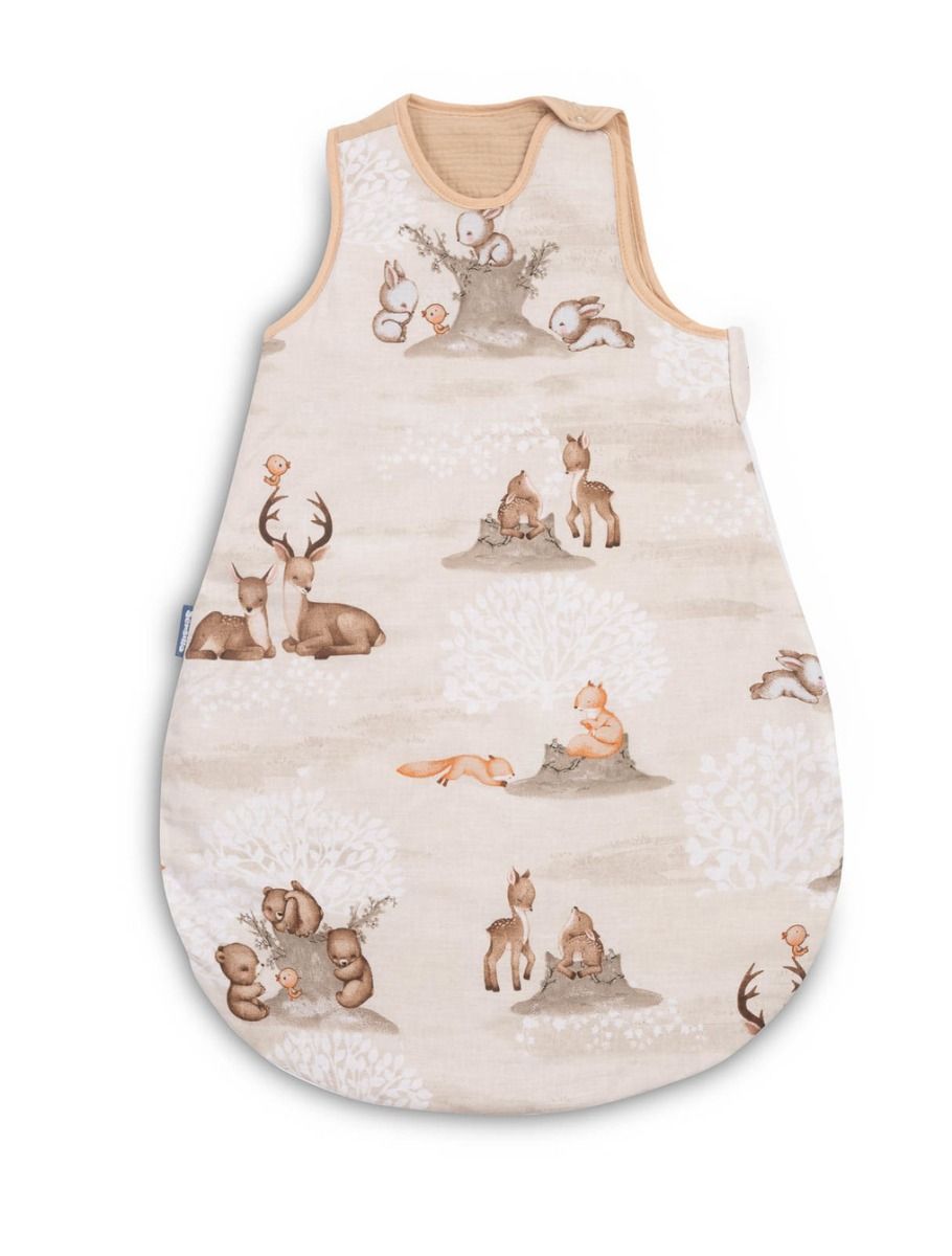 El interior y la parte posterior están elaborados en muselina de algodón, un tejido suave y transpirable que es ideal para la delicada piel del bebé. El saco de dormir está equipado con una cremallera bidireccional que recorre todo el saco, lo que permite realizar cambios de pañal sin tener que sacar al bebé completamente del saco. Además, incluye una correa desmontable para una apertura y cierre rápidos.