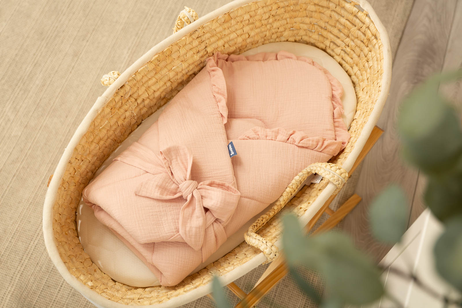 Este saco para envolver bebés en color rosa ha sido diseñado especialmente para recién nacidos e infantes. Su cierre de velcro te permite sostener cómodamente al bebé mientras lo alimentas y lo ayudas a conciliar el sueño. Una vez desplegada, esta envoltura puede utilizarse exitosamente como edredón para la cuna o el cochecito, o incluso como una suave alfombra de juego. Está confeccionada al 100% con algodón de alta calidad. Tanto la capa exterior como la interior están elaboradas con una muselina agradable al tacto, proporcionando suavidad en cada uso. El relleno del cono está compuesto por una tela no tejida de silicona de textura mullida.