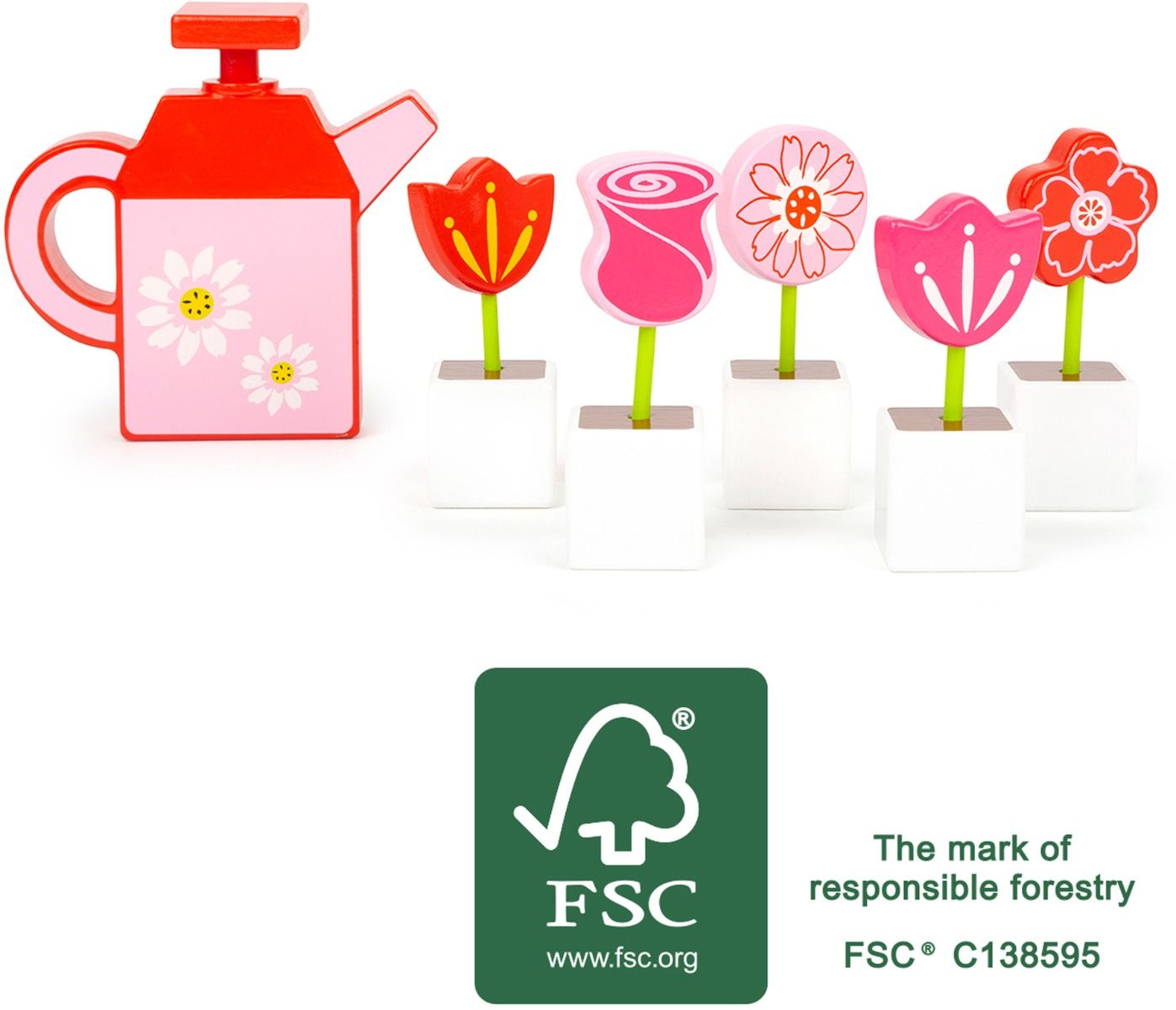 Con este juego de 11 piezas de madera FSC® 100% certificada, los pequeños jardineros y floristas pueden crear fácilmente un colorido mar de flores. Con la regadera de mango y función de bombeo, las flores deben ser regadas regularmente. Los niños aprenden a cuidar las flores y las plantas en juegos de rol activos. ¡Insertar los tallos de las flores en los maceteros promueve juguetonamente la motricidad fina!