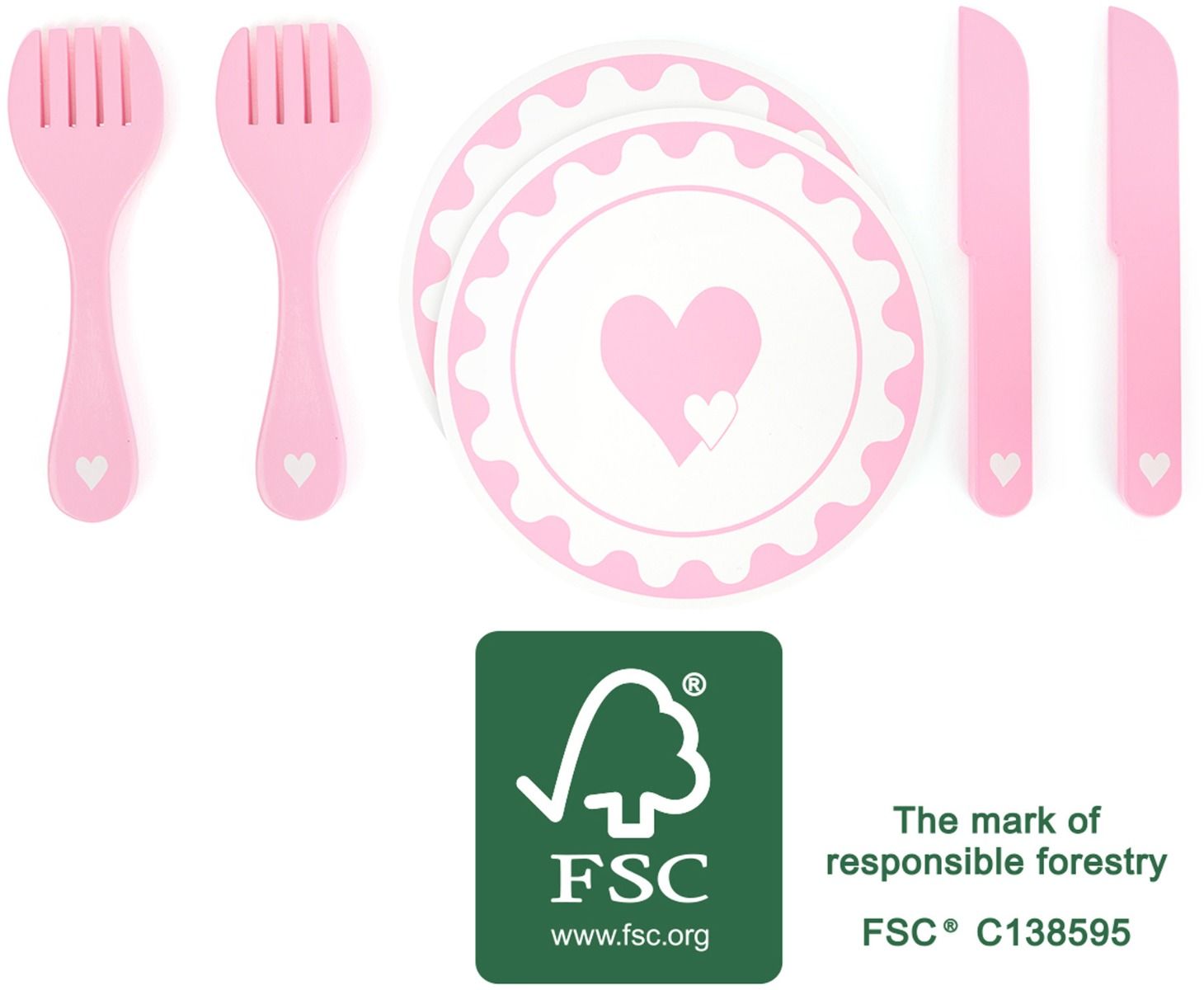 Este set de cubiertos y platos de juguete están fabricados en madera 100% Fsc certificada y es perfecto para complementar cualquier cocina infantil.