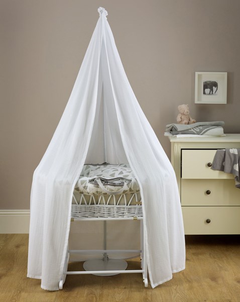 El moisés de mimbre lacado en blanco o gris, con 2 asas de aspecto de cuero para poder desplazar con facilidad. Vestiduras diseñadas en Uk, realizadas a mano con un tejido 100% algodón súper suave y transpirable que además incluye un forro interior para una apariencia más mullida donde acostar al recién. Soporte tipo mecedora de madera con freno y dosel con barra y cortinas para crear un ambiente relajante y sin luces fuertes para dormir al bebé.