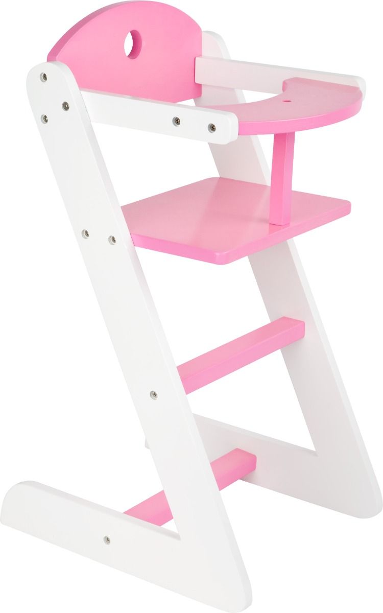 Esta trona para muñecas está fabricada en madera y lacada en color rosa y blanco.