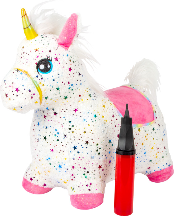 Este unicornio saltarín combina un robusto cuerpo de goma con un suave y mullido pelaje. Con una melena y cola blancas, una silla brillante y estrellas de colores, esta criatura de cuento de hadas tiene todo lo que se puede desear. Saltar arriba y abajo entrena el equilibrio, la conciencia corporal, la musculatura y el balance. Incluye una bomba de aire compatible.